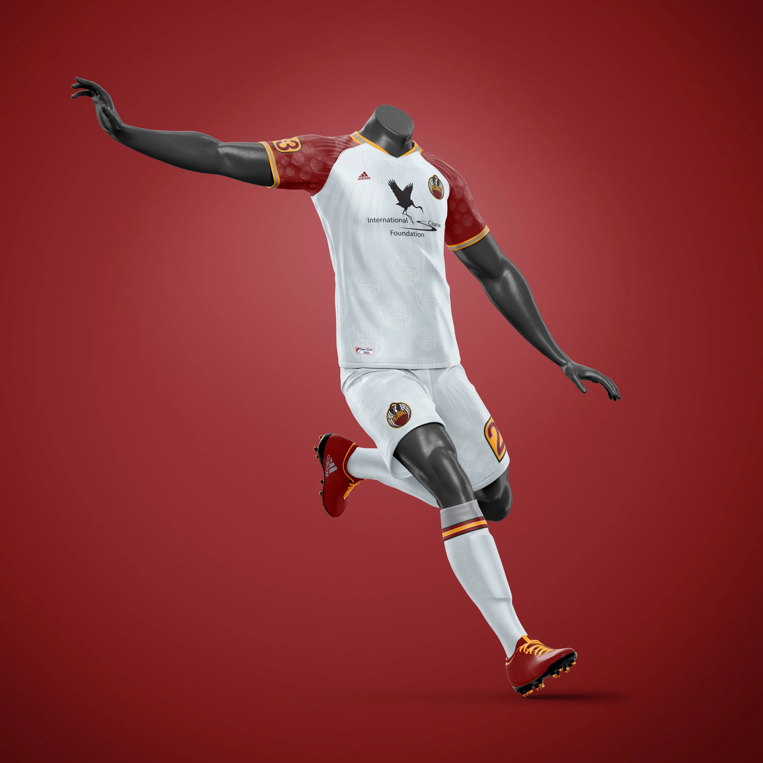 The kit system extends the identity across three distinct designs. The Primary Kit is clean and white, with maroon raglan sleeves carrying the crane silhouette and brand texture — built for legibility on the pitch. The Alternate Kit inverts the palette to a deep maroon with grey shorts, maintaining full brand consistency. The third kit — dubbed Christmas in July — takes a bold departure, pairing a black base with electric pink chevron patterns and sky blue shorts for a high-energy, culture-forward look that reflects the expressive side of modern soccer kit design.